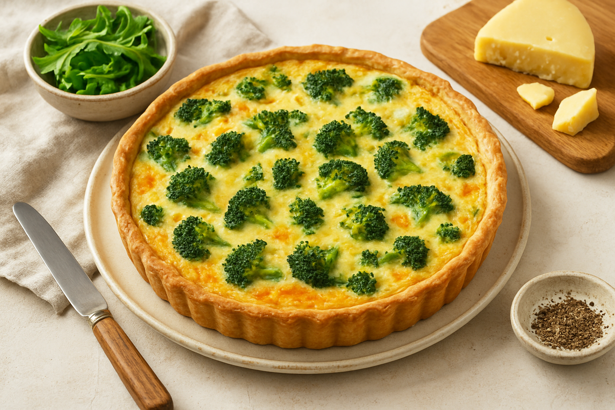 - Для начинки: 300 г брокколи, 3 яйца, 200 мл сливок (20-30%), 100 г твердого сыра (например, Грюйер или Пармезан), соль, перец и щепотка мускатного ореха.