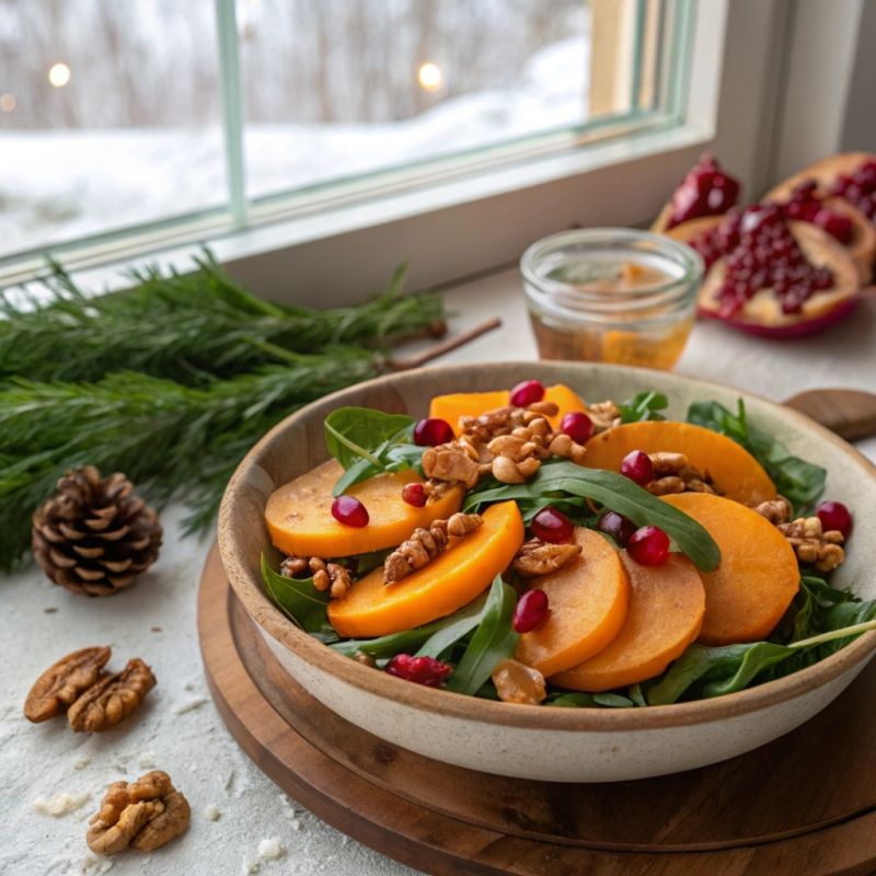 Ломтики хурмы, блестящие зерна граната и хрустящие орехи создают базу, к которой добавляется зелень и лёгкий дрессинг из оливкового масла, мёда и лимонного сока. Простые шаги превращаются в свежий, насыщенный вкус, который можно повторить в будни без лишних хлопот.
