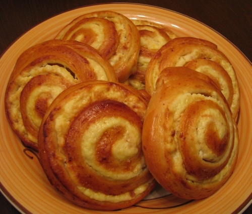 На раскатанный пласт равномерно распределите творожную начинку, оставив один край без начинки. Сверху начинку можно посыпать еще парой ложек сухарей, а свободный край смазать взбитым яйцом. Заверните тесто с начинкой в рулет, а затем нарежьте его на небольшие витушки.
