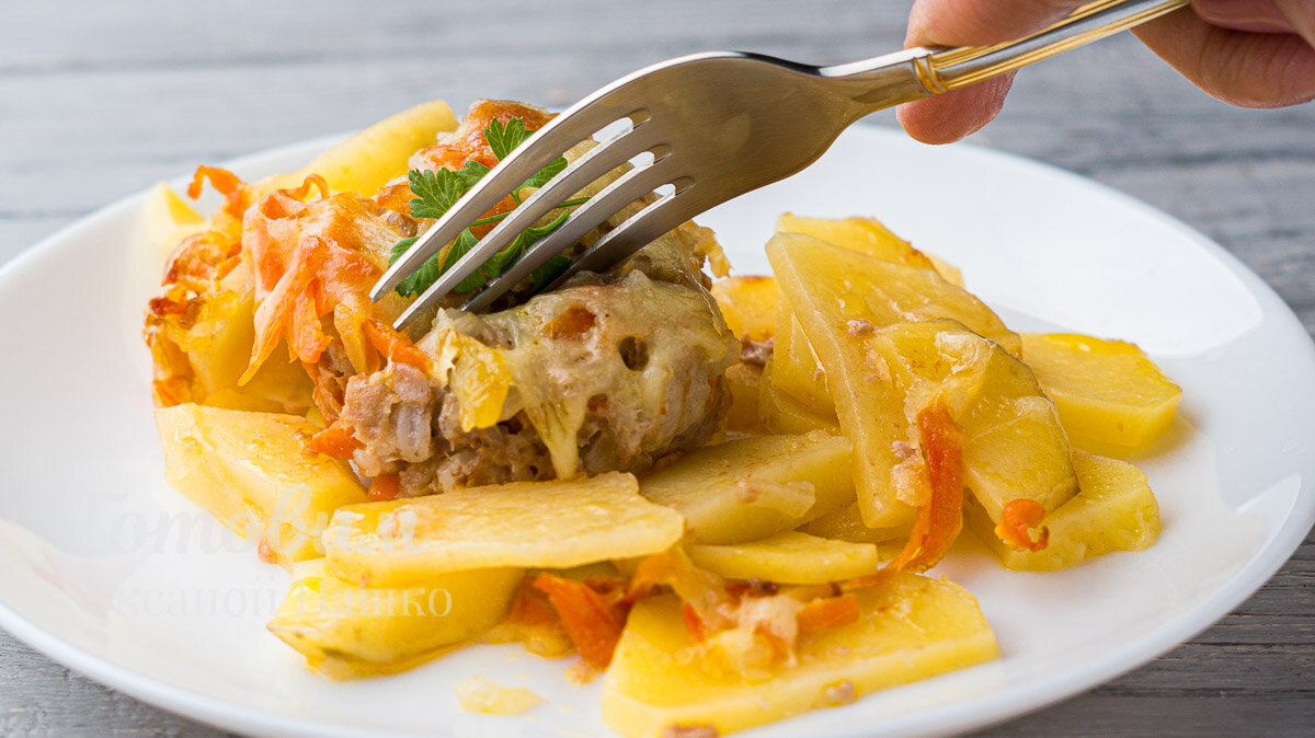 Представляем вашему вниманию простое и сытное блюдо, которое станет настоящей находкой для семейного обеда — картошка с тефтелями, запечённая в духовке. Этот рецепт не только упростит процесс приготовления, но и поможет сэкономить время, так как гарнир и основное блюдо готовятся одновременно!