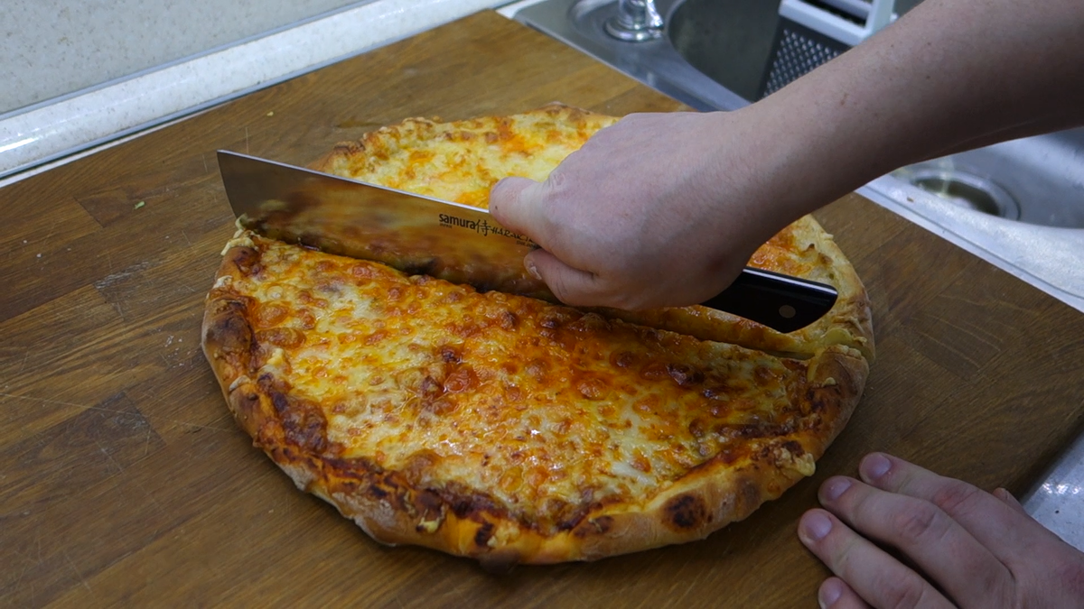 Завершив подготовку соусов, можно приступить к сборке пиццы. Тесто раскатывают, лишние края отрезают. На одну половину выкладывают соус Бешамель, на другую — томатный соус, и щедро всем этим покрывают разнообразные сыры. Пиццу отправляют в заранее разогретую духовку на 10 минут.