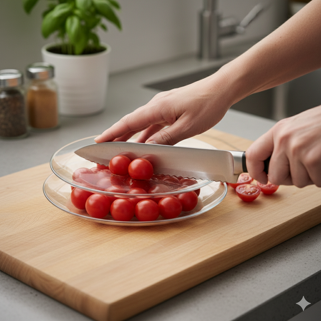 Эта техника отлично работает благодаря тому, что две параллельные поверхности удерживают круглые плоды без возможности перекатывания. Нож проходит ровно посередине, разделяя все помидоры на аккуратные половинки одновременно.