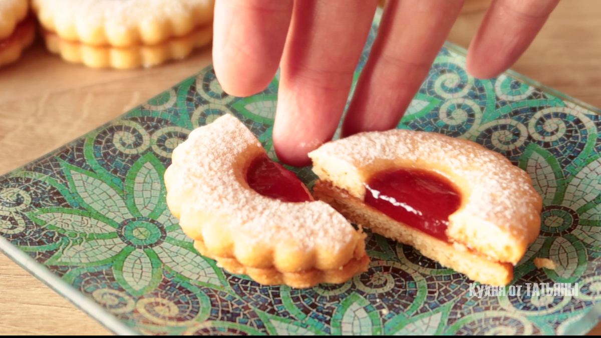 На одну половинку печенья наносится джем, что удобно делать с помощью кондитерского мешка или просто ложкой. Затем сверху накрывается второй половинкой, и всё посыпается сахарной пудрой.