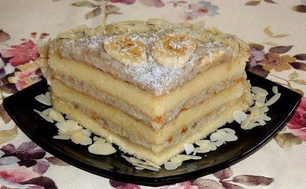 В завершение торт декорируют кусочками банана, миндалем и кокосовой стружкой.