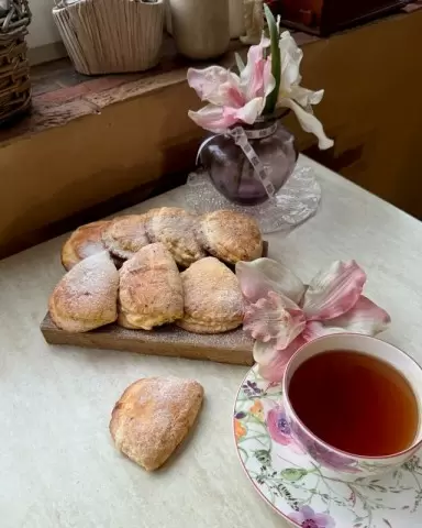 5. Формирование сочников: Духовку разогрейте до 200 градусов. Смешайте желток с чайной ложкой воды для смазывания. Каждый кусок теста раскатайте в овал, положите начинку и накрывайте второй половиной.