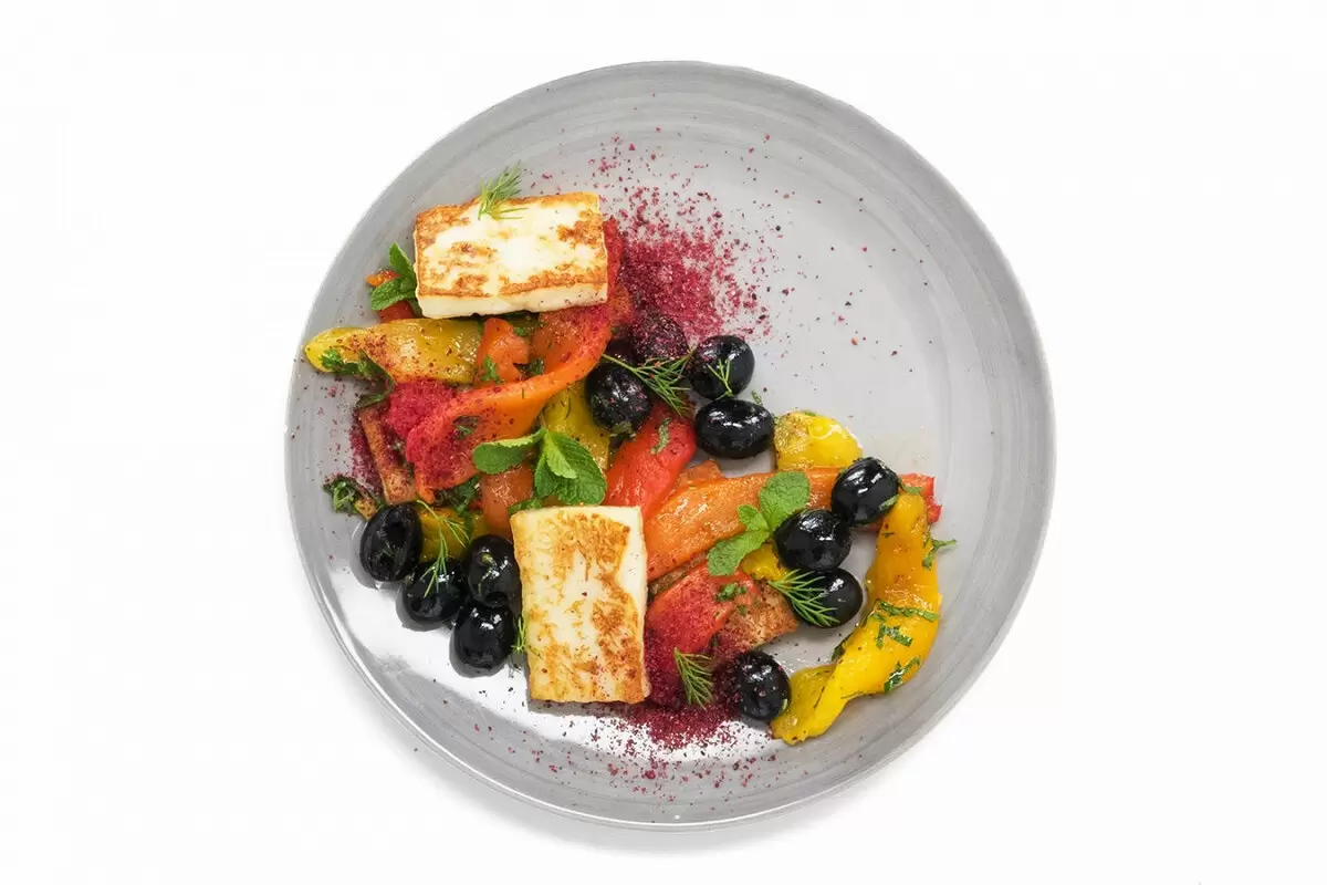 Очистить перцы от семян и белых частей, полить оливковым маслом и запекать в духовке при температуре 200 градусов около 25 минут. После запекания поместить их в контейнер и накрыть пленкой для остывания.Нарезать сыр халуми на не слишком тонкие ломтики и обжарить на сковороде с оливковым маслом до золотистой корочки. После жарки выложить сыр на бумажные полотенца, чтобы убрать излишки жира.Снять кожицу с остывших перцев и нарезать их крупными полосками. Измельчить свежую зелень и смешать с маслинами и печеными перцами, добавив маленькую щепотку соли и перца для вкуса.На красивое блюдо выложить золотистый сыр халуми, рядом разместить смесь из перцев и маслин, посыпать все сумахом и украсить веточками укропа и мяты.Этот салат станет изюминкой любого праздничного стола или приятным дополнением к ужину. Не забудьте подписаться на интересные рецепты, которые вдохновят на новые кулинарные подвиги!