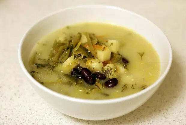Репчатый лук, морковь, корень петрушки и сельдерей нарезать и обжарить на сливочном масле до золотистости. Это придаст блюду насыщенный аромат.К отвару фасоли добавить необходимое количество воды и довести до кипения. После этого добавить мелко нарезанный картофель и варить до полуготовности.Через 7-10 минут после добавления картофеля, следует положить отварную фасоль. Не забудьте добавить огуречный рассол, черный перец горошком, лавровый лист и соль по вкусу.Когда суп готов, его нужно снять с огня и заправить взбитым яичным желтком, растертым со сметаной. В завершение, посыпать мелко нарубленной зеленью для свежести и яркости.Готовый рассольник порадует вас и ваших близких, добавив особую атмосферу к любому столу. Приятного аппетита!