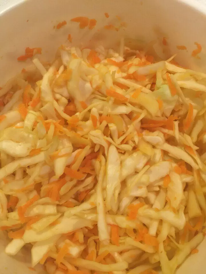 Тщательно нашинковать капусту и аккуратно размять её руками, чтобы она стала мягче. Затем поместить в глубокой салатнице, посолить и хорошо перемешать.Натереть морковь на крупной терке и добавить к капусте. Затем засыпать всё сахаром и снова перемешать.Через 15–20 минут, когда сахар растворится и салат даст немного сока, добавить уксус и ещё раз тщательно смешать.Перед подачей к столу, дайте настояться 30 минут. Салат должен приобрести сочность и насыщенный аромат.