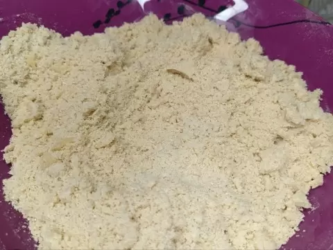 Даже небольшие детали играют важную роль в этом рецепте. Процеженная обжаренная мука отправляется в масляную смесь, после чего все перетирается в однородную крошку, известную как хориз. Эта начинка должна напоминать по своей консистенции песок.
