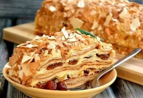 Торт "Наполеон", который приятно удивляет, теперь можно приготовить из тонкого лаваша! Этот вариант существенно упрощает процесс, сокращая время на приготовления и снижая калорийность, оставаясь при этом восхитительно вкусным благодаря масляному заварному крему и многослойной структуре. И кто бы мог подумать, что вместо традиционных тестяных коржей здесь используются лакомства из лаваша. Чтобы сделать десерт ещё более интересным, добавим прослойку из дерева черешневого варенья.