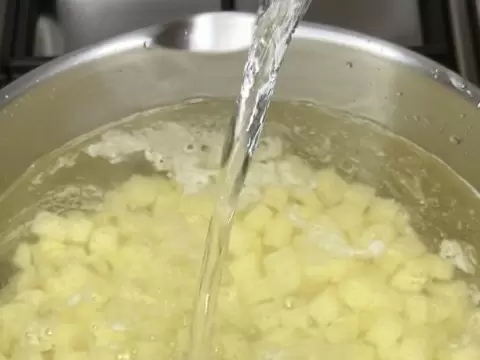 Первым делом тщательно промывают и очищают картофель, нарезая его на мелкие кубики или соломкой. Ставят варить в кастрюле с подсоленной водой. В это время куриное филе нарезают кубиками и обжаривают на сливочном масле до золотистой корочки.
