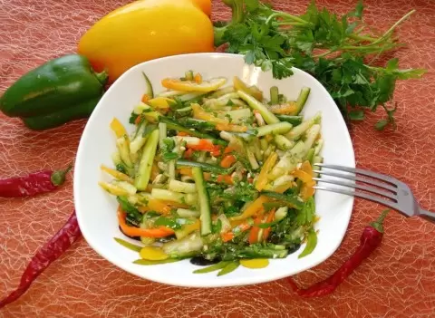 Для настоящих любителей острых закусок представлен замечательный рецепт яркого и ароматного салата, который легко можно подготовить за короткое время. Этот салат обладает пикантным вкусом и уникальной текстурой, которая сразу же привлечет внимание. Его можно подать сразу же после приготовления, но немного настоявшийся он станет ещё более насыщенным.