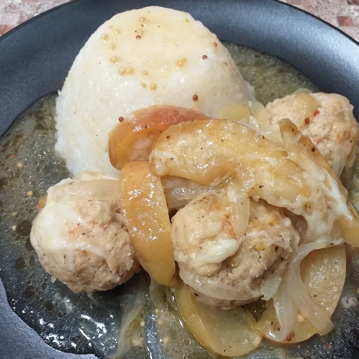 В процессе приготовления соуса, яблоки нарезаются дольками, а лук перьями. В глубокой сковороде разогреваем растительное масло и обжариваем лук с яблоками в течение 10 минут. Далее добавляем горчицу и муку, добавляем соевый соус и заливаем водой, после чего тушим 10 минут на медленном огне.