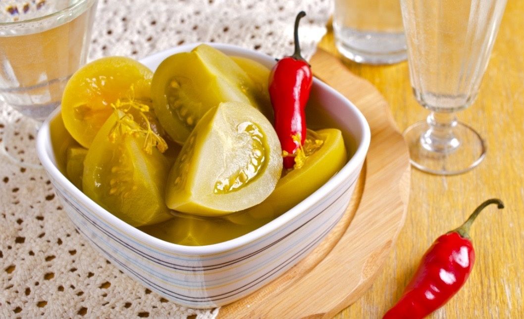 Классика: буро?зелёные плоды фаршируют смесью тёртой моркови, мелко рубленой петрушки, кинзы, чеснока и острого перца; выкладывают в тару вместе с ломтиками хрена и болгарским перцем. Рассол — 1 л воды с солью, сахаром и набором специй (гвоздика, лавр, кориандр, перцы) — кипятят и остужают. Первые 3–4 дня при комнатной температуре, затем сезонное охлаждение 14–20 дней: помидоры готовы к употреблению и хранятся в холодильнике до 2–3 месяцев, усиливая вкус с течением времени.