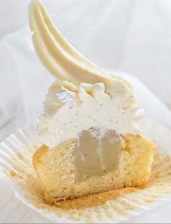 Удалите сердцевину кексов, используя чайную ложку, оставляя дно и стенки. Наполните образовавшиеся углубления банановой начинкой и украсьте сверху ванильным кремом.