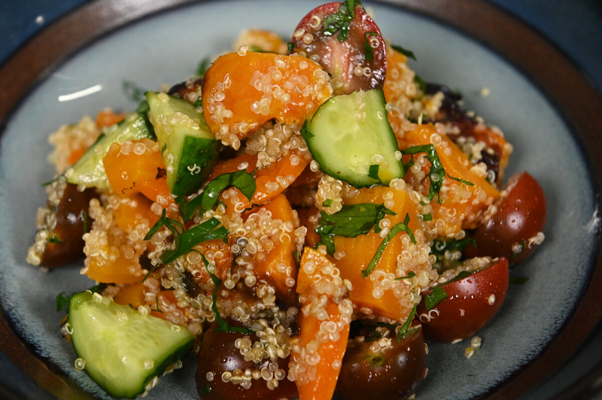 Шаг 5: Из запеченной тыквы нарежьте кубики и добавьте к другим овощам. Затем вмешайте отваренное киноа. Заправьте салат оливковым маслом, сбрызните лимонным соком и приправьте солью по вкусу, тщательно перемешайте.