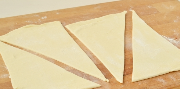 Подготовьте масло: нарежьте его пластинами, выложите на пергамент в квадрат и раскатайте до 18x18 см. Охладите 15 минут. Затем раскатайте тесто в квадрат 25x25 см, поместите масло по центру и заверните его. Раскатайте в прямоугольник 60x20 см и сложите тройным слоем. Повторите этот процесс дважды с часом охлаждения между раскатками.