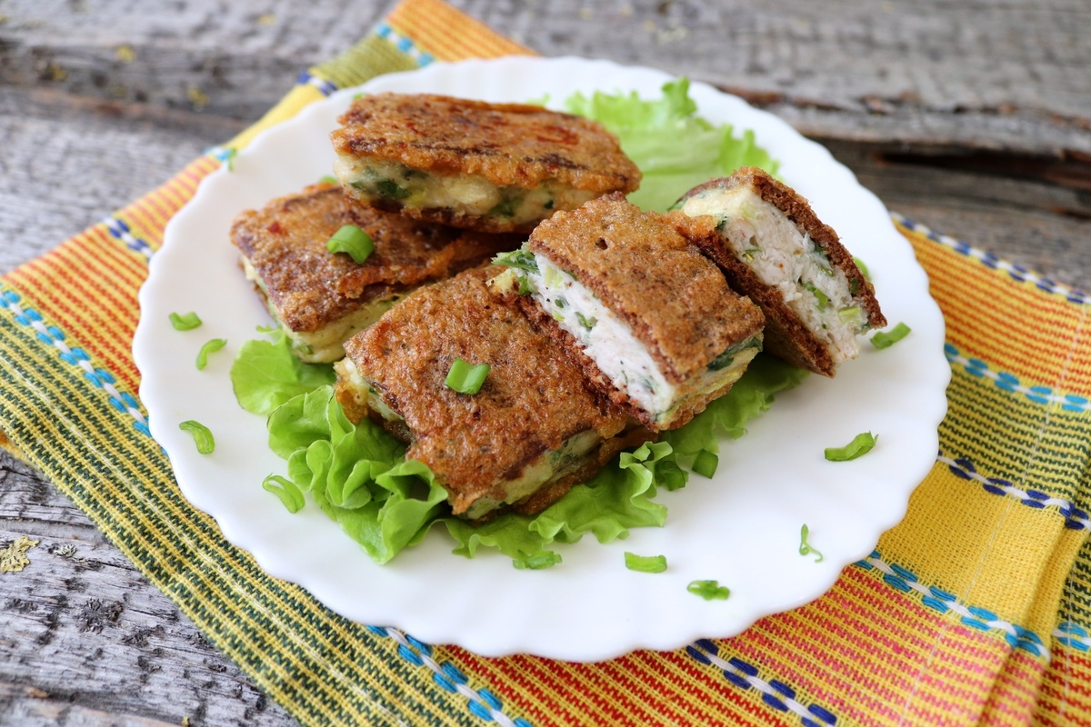 Взбейте яйца до получения однородной массы, затем обмакните каждый "бутерброд" в яичную массу. Жарьте котлеты на среднем огне с обеих сторон до золотистой корочки. В результате получится удовлетворяющая закуска, которая приятна как в горячем, так и в холодном виде.