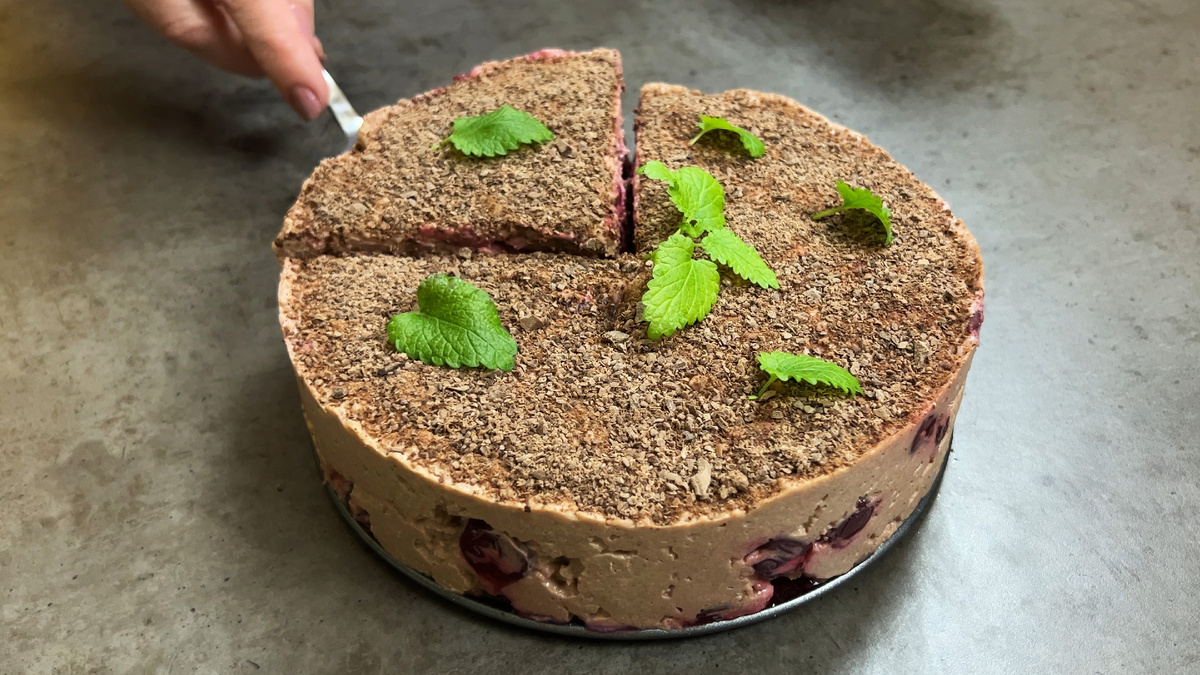 После застывания аккуратно снять кольцо и удалить пленку. Посыпать верх десерта натертым шоколадом и украсить свежими веточками мяты. Такой десерт легко нарезается и восхитительно вкусен благодаря гармоничному сочетанию вишни, творожного крема и шоколада!