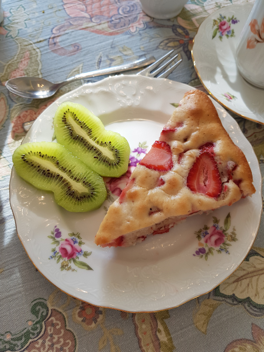 Пока пирог охлаждается, очистите киви и нарежьте его тонкими пластинами. Выложите их на тарелку в виде бабочки рядом с кусочком пирога – это добавит визуального удовольствия вашему летнему завтраку.