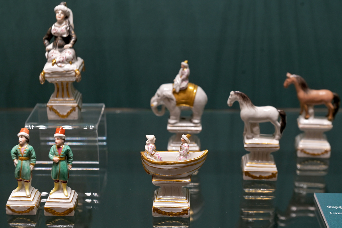 Шахматные фигуры, изготовленные в 1750-х годах, стали первыми яркими примерами мелкой пластики Невской мануфактуры. Каждая фигура выполнена с тщанием и мастерством: ферзь изображен в позе лотоса, ладья принимает форму лодки с вмещающимися в ней фигурками, а на спине слона расположился всадник, смотрящий вперёд. Пешки выполнены в качестве слуг и различаются по цвету халатов — белые и зелёные. Характерная роспись с выразительными лицами и тонкими линиями является отличительной чертой русского фарфора XVIII века.