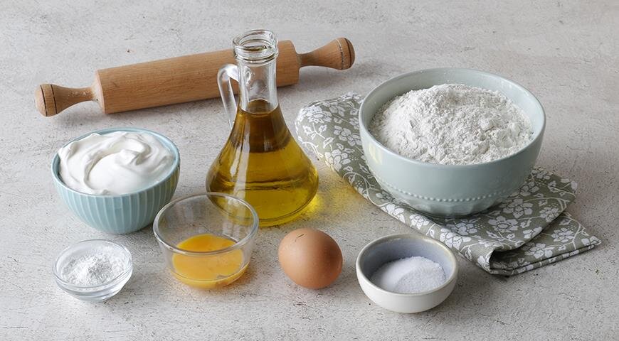3. Вылейте сметану в углубление, начните замешивать тесто, постепенно добавляя яйцо и желток, чтобы получить мягкую и эластичную массу.