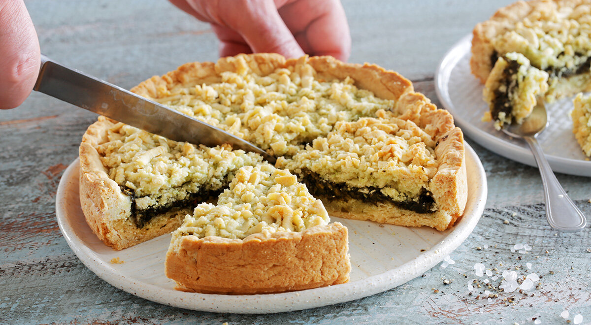 Шаг 5: Нагрейте духовку до 180°C. Выложите начинку на тесто, натрите оставшееся тесто сверху и выпекайте 20–25 минут. Пусть пирог немного остынет перед подачей.