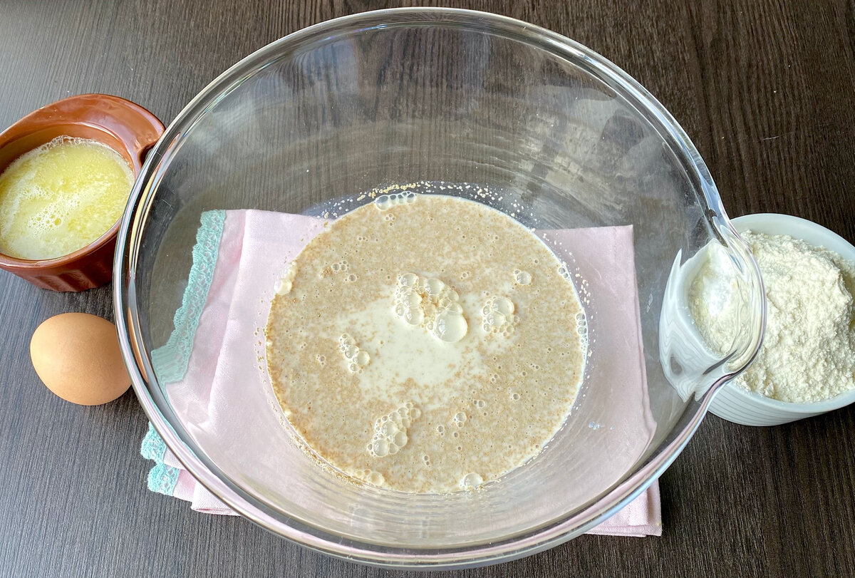 Начинается всё с теплого молока, которое следует налить в большую миску. Затем нужно добавить дрожжи и тщательно перемешать. Следующим шагом становится вливание растопленного сливочного масла, но нельзя допускать, чтобы оно было горячим. Далее вбивается яйцо и все ингредиенты снова перемешиваются венчиком. После этого добавляются соль, сахар и, постепенно, мука.