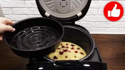 Далее подготовленный тесто выкладывается в предварительно смазанную масло чашу мультиварки. Не забудьте добавить вишню, слегка утопив ее в тесте, чтобы она равномерно распределилась внутри коржа.
