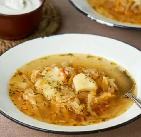 Подготовьте овощи, нарезав их соломкой. Рыбное филе, избавленное от костей, порежьте брусочками и обжарьте на сливочном масле. Лук и морковь тоже обжарьте до мягкости. В кипящую воду добавьте капусту и варите в течение 10 минут, затем добавьте картошку и лавровый лист, готовьте еще 10 минут. Далее добавьте пассерованные овощи и рыбу, варите еще 3 минуты. Приправьте по вкусу солью, перцем и соком лимона. При подаче посыпьте зеленью и подавайте со сметаной.