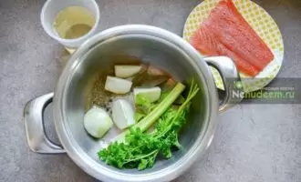 Далее в небольшой кастрюле соединить нарезанный сельдерей, очищенную и разрезанную на четвертинки луковицу, мяту, эстрагон, петрушку, лавровый лист и чёрный перец. Залить все ингредиенты водой, добавить белое вино и довести до кипения, варить на медленном огне около 25 минут.