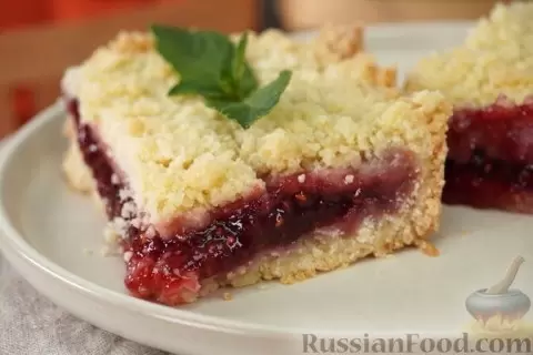 - Насыпной пирог с вареньем. Этот пирог удивляет своей простотой. Быстрое приготовление песочного теста без необходимости его охлаждения дает возможность моментально формировать и выпекать лакомство.