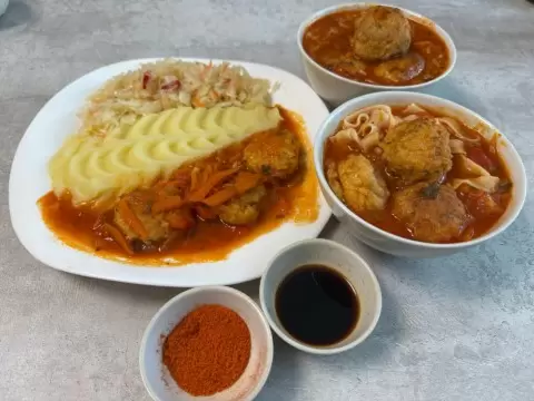 Для лагмана отварите лапшу в подсоленной воде, дайте стечь и добавьте немного растительного масла, чтобы не прилипала. Затем подогрейте в микроволновке, если остыла. Смешайте лапшу с фрикадельками и щедро добавьте соус.