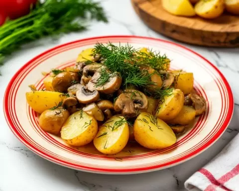Когда лук станет золотистым, добавьте грибы и жарьте их в течение 5 минут, немного увеличив огонь и добавив щепотку соли для вкуса. Затем добавьте отваренный картофель, аккуратно перемешайте и продолжайте жарить вместе ещё пару минут. Завершите приготовление свежей зеленью, которая придаст блюду яркость и свежесть.