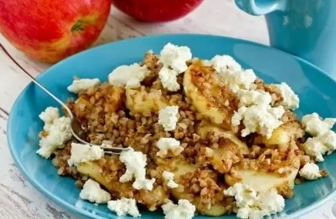 После этого добавляется набухшая гречка. Все тщательно перемешивается, чтобы крупа пропиталась сладким ароматом яблок, и прогревается на сковороде еще минуту. Затем блюдо выкладывается на тарелку и посыпается свежим творогом сверху.