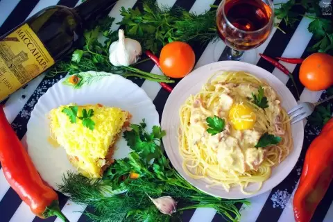 Первым делом нужно тонко нарезать репчатый лук. После этого на разогретом оливковом масле обжарить лук и бекон до появления золотистой корочки. В эту массу вливаются сливки, всё тщательно перемешивается и прогревается в течение 1-2 минут. Спагетти отварить в подсоленной воде до состояния «al dente». Затем слить их и смешать с соусом из бекона и лука, равномерно распределив соус по пасте. При подаче положить в каждую тарелку свежий желток и посыпать натертым Пармезаном для завершения этого гастрономического наслаждения.