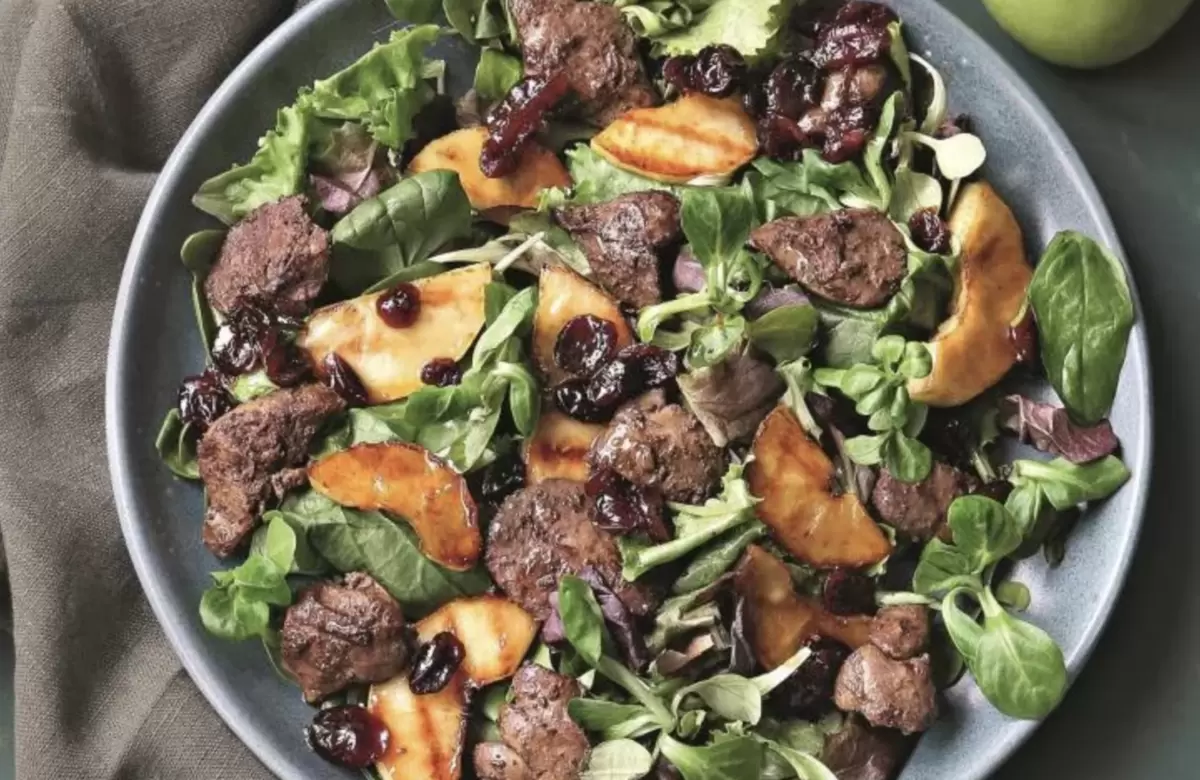 В глубокой миске скомбинируйте листья салата, обжаренные яблоки и печень, добавляя гранатовые зерна и кедровые орехи. Тщательно перемешайте и заправьте приготовленным соусом перед подачей на стол. Ваш салат готов — наслаждайтесь вкусом!