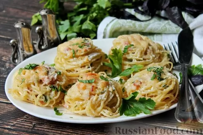 Завершите вечер «гнёздами» из спагетти с беконом и сыром, которые не только порадуют глаз, но и станут настоящим кулинарным шедевром.