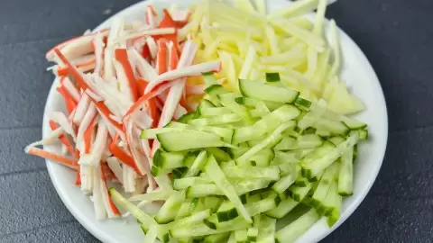 Приготовление занимает всего семь минут, а результат порадует насыщенным и питательным блюдом. Для разнообразия можно дополнить салат отварным картофелем или рисом, а также добавить тертый сыр. Для заправки отлично подойдет не только майонез, но и сметана.