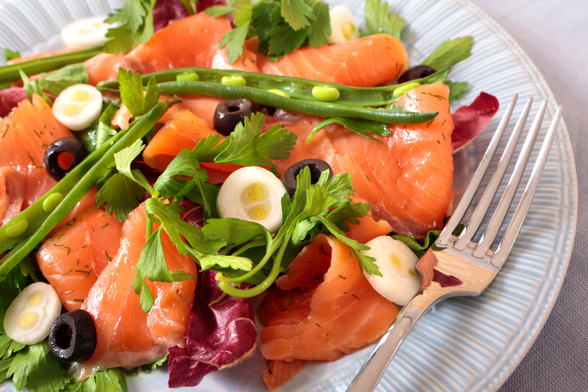 Салат с копченой форелью, манго и чили-лаймовой заправкой подарит вам аромат Бангкока. Уберите кости из рыбы, нарежьте манго и огурец, добавьте кинзу и мяту, завершая вкусной заправкой. Эта эксплозия вкусов — идеальный способ удивить своих гостей.