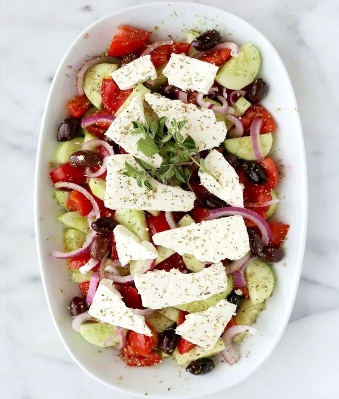 Перед подачей салат следует заправить смесью оливкового масла, соли и винного уксуса. Посыпьте сверху сушеным орегано и украсьте веточками свежего. Греческий салат можно разнообразить, добавив редис, авокадо или сладкий перец – дайте волю своей фантазии. Представьте, как кушаете это блюдо с чудесным видом на Средиземное море и наслаждаетесь каждым укусом.